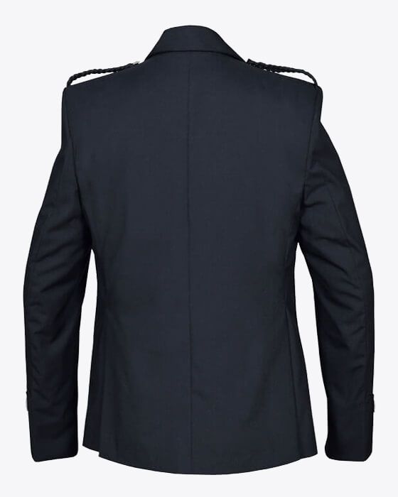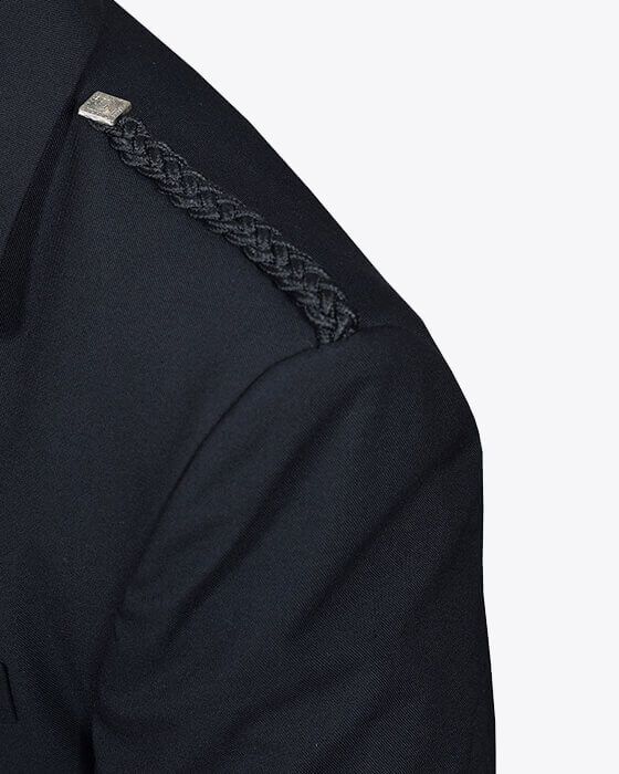 The jacket has a single button on the front, two side vents, gauntlet cuffs with 3 buttons, pocket flaps with 3 buttons, cloth epaulettes, and square silver jacket buttons. This jacket comes with a 5-button waistcoat. The kilt jacket should always be worn open so that the detailing on the waistcoat is visible. The jacket is made from premium-quality black barathea wool.