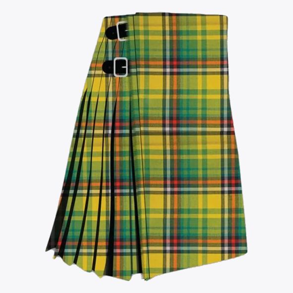 Each tartan kilt has 3 buckles and straps for size adjustment: genuine leather waist straps (4" long by 1 1/4" wide). Kilt straps on this kilt are set with an allowance of 2" looser. This kilt's front edge has fringe and is pleated to the sett but can be pleated to stripe by request. There are two belt loops at the back. The kilt has a 100% cotton lining for a soft feel when being worn. The standard kilt comes with a 5-yard, but you can convert it into an 8-yard by selecting the "8-yard kilt" option.