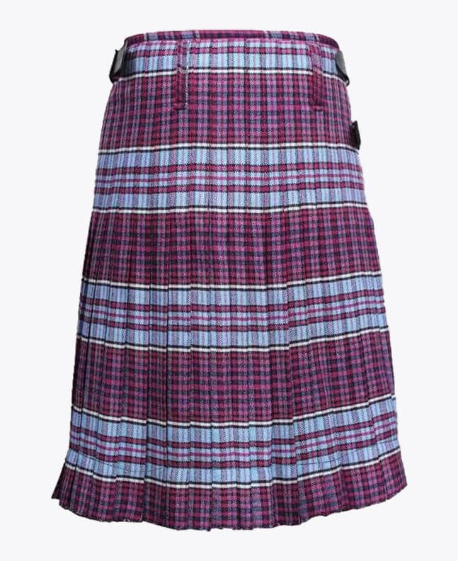 Each tartan kilt has 3 buckles and straps for size adjustment: genuine leather waist straps (4" long by 1 1/4" wide). Kilt straps on this kilt are set with an allowance of 2" looser. This kilt's front edge has fringe and is pleated to the sett but can be pleated to stripe by request. There are two belt loops at the back. The kilt has a 100% cotton lining for a soft feel when being worn. The standard kilt comes with a 5-yard, but you can convert it into an 8-yard by selecting the "8-yard kilt" option.