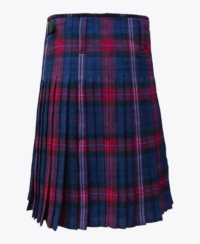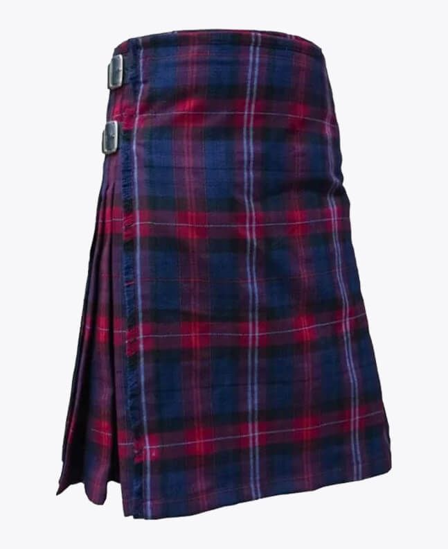 Each tartan kilt has 3 buckles and straps for size adjustment: genuine leather waist straps (4" long by 1 1/4" wide). Kilt straps on this kilt are set with an allowance of 2" looser. This kilt's front edge has fringe and is pleated to the sett but can be pleated to stripe by request. There are two belt loops at the back. The kilt has a 100% cotton lining for a soft feel when being worn. The standard kilt comes with a 5-yard, but you can convert it into an 8-yard by selecting the "8-yard kilt" option.