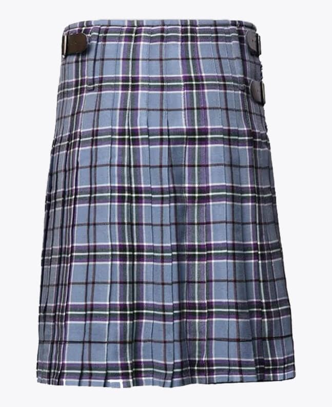 Each tartan kilt has 3 buckles and straps for size adjustment: genuine leather waist straps (4" long by 1 1/4" wide). Kilt straps on this kilt are set with an allowance of 2" looser. This kilt's front edge has fringe and is pleated to the sett but can be pleated to stripe by request. There are two belt loops at the back. The kilt has a 100% cotton lining for a soft feel when being worn. The standard kilt comes with a 5-yard, but you can convert it into an 8-yard by selecting the "8-yard kilt" option.