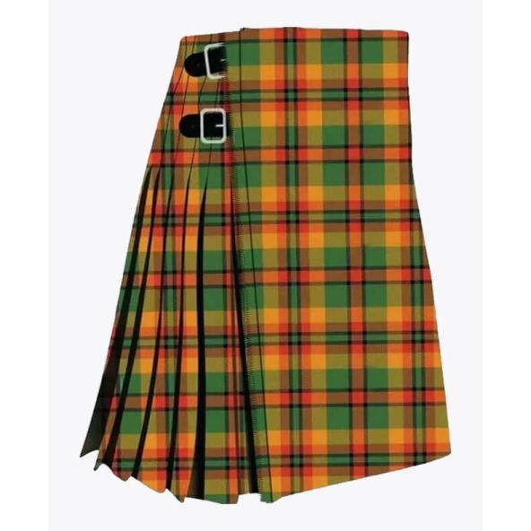 Each tartan kilt has 3 buckles and straps for size adjustment: genuine leather waist straps (4" long by 1 1/4" wide). Kilt straps on this kilt are set with an allowance of 2" looser. This kilt's front edge has fringe and is pleated to the sett but can be pleated to stripe by request. There are two belt loops at the back. The kilt has a 100% cotton lining for a soft feel when being worn. The standard kilt comes with a 5-yard, but you can convert it into an 8-yard by selecting the "8-yard kilt" option.