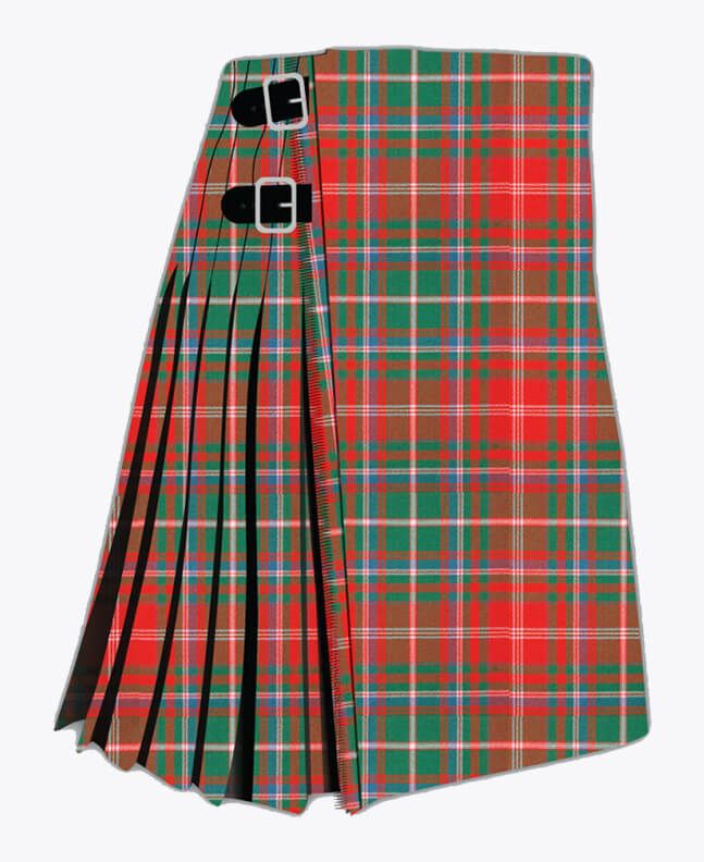 Each tartan kilt has 3 buckles and straps for size adjustment: genuine leather waist straps (4" long by 1 1/4" wide). Kilt straps on this kilt are set with an allowance of 2" looser. This kilt's front edge has fringe and is pleated to the sett but can be pleated to stripe by request. There are two belt loops at the back. The kilt has a 100% cotton lining for a soft feel when being worn. The standard kilt comes with a 5-yard, but you can convert it into an 8-yard by selecting the "8-yard kilt" option.
